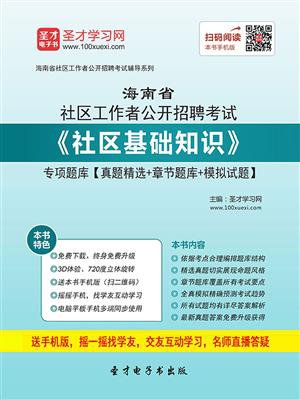 本书特别适用于参加海南省社区工作者公开招聘考试的考生。本书是详解海南省社区工作者公开招聘考试《社区基础知识》的题库,包括真题精选、章节题库和模拟试题三大部分。具体如下:第一部分为真题精选。社区工作者公开招聘考试是公开招聘社会人员和毕业学生到社区工作的考试,考试时间基本不固定,招聘人数根据具体情况而定,真题搜寻难度大。本书选取具有代表性,能体现考试趋势的最新真题,并给出了详尽的解析,供学员参考。第二部分为章节题库。依据各个地方或单位的招考公告(或大纲)以及历年真题的命题特点合理安排章节,共分为6章,基本每道习题都有详尽的解析,涵盖考试主要知识点。第三部分为模拟试题。根据历年考试真题的命题规律及热门考点进行考前模拟,其试题风格与社区工作者公开招聘考试真题一样。通过模拟试题的练习,学员既可以用来检测学习该考试科目的效果,又可以用来评估对自己的应试能力。