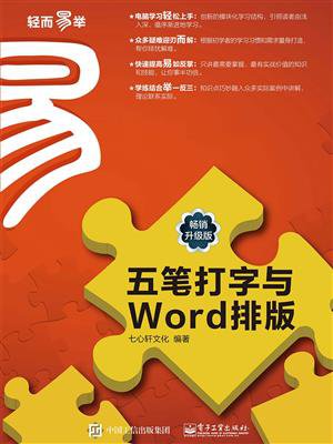 七心轩文化编著的《五笔打字与Word排版(附光 盘畅销升级版)》从键盘布局和指法练习讲起,详细介 绍了五笔字型输入法和文档处理的相关知识。全书共 分9章,主要内容包括键盘结构与指法练习、认识汉字 输入法、五笔输入法入门、汉字拆分与五笔输入、提 高五笔输八速度、初识Word 2016、设置文档格式、 实现图文混排,以及页面设置与文档打印。 本书注重原理的讲解和技能的提高,采用“试一 试+学一学+练一练+想一想”模式,结合办公实例,图 文并茂地介绍了使用五笔打字和Word排版的具体操作 方法。本书适合广大五笔打字与Word排版爱好者,以 及各行各业需要学习五笔打字与Word排版的人员使用 。