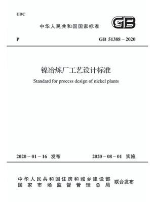 中华人民共和国住房和城乡建设部公告 2020年第40号 住房和城乡建设部关于发布国家标准《镍冶炼厂工艺设计标准 》的公告 现批准《镍冶炼厂工艺设计标准 》为国家标准,编号为GB 51388-2020,自2020年8月1日起实施。 其中,第5.1.2(12)、5.1.3(11、12、13、14)、5.2.1(7)、5.2.2(3)、5.5.2(3)、6.1.2(3)、6.2.7(4)、10.1.8、10.1.9、10.3.2(3)为强制性条文,必须严格执行。 本标准在住房和城乡建设部门户网站(www.mohurd.gov.cn)公开,并由住房和城乡建设部标准定额研究所组织中国计划出版社出版发行。